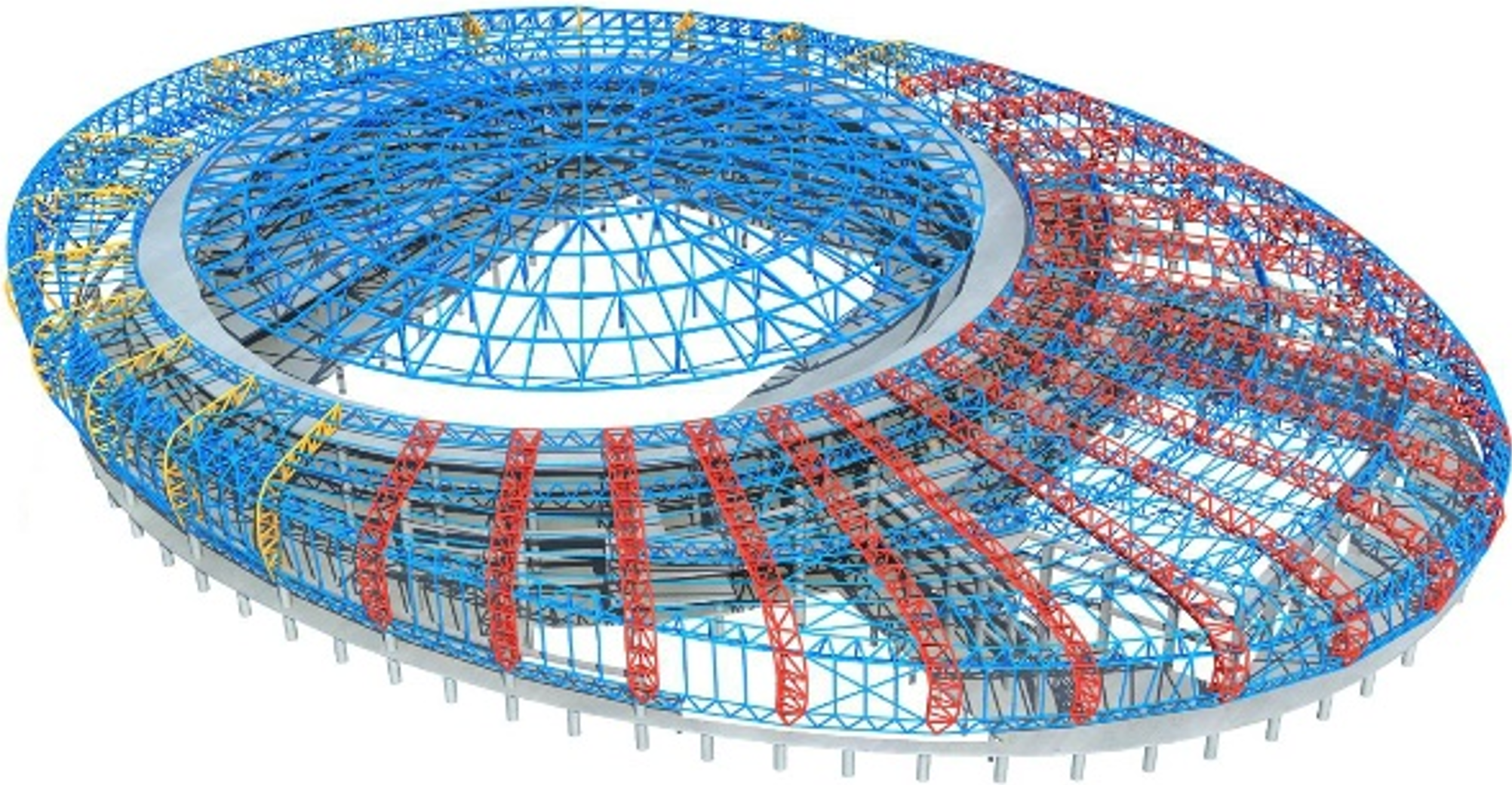 基于弦支穹顶屋盖体系数字模型,开展施工仿真模拟,指导钢箱梁、斗屏机构及索杆安装作业,同时辅以实时监测,提高了施工质量与效率。