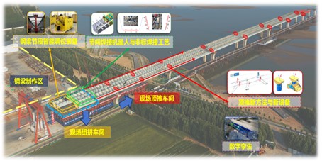 项目以量大面广的混凝土结构、广泛应用的钢混组合结构、大跨缆索承重结构为研究对象,研发了桥梁钢筋部品工业化建造技术与装备,类比钢结构,提出“装配化设计-制造-安装”的钢筋部品工业化建造新方法;研制了大跨柔性钢梁智能化组拼与顶推,打造“组拼-顶推”车间,在现场实现覆盖施工全过程的流水生产模式;发明了大直径超长钢主缆智能化架设、监测与控制技术,通过植入“传感光纤”,全域实时监测温、湿度等关键参数,辅助建养一体化升级。具体如下: