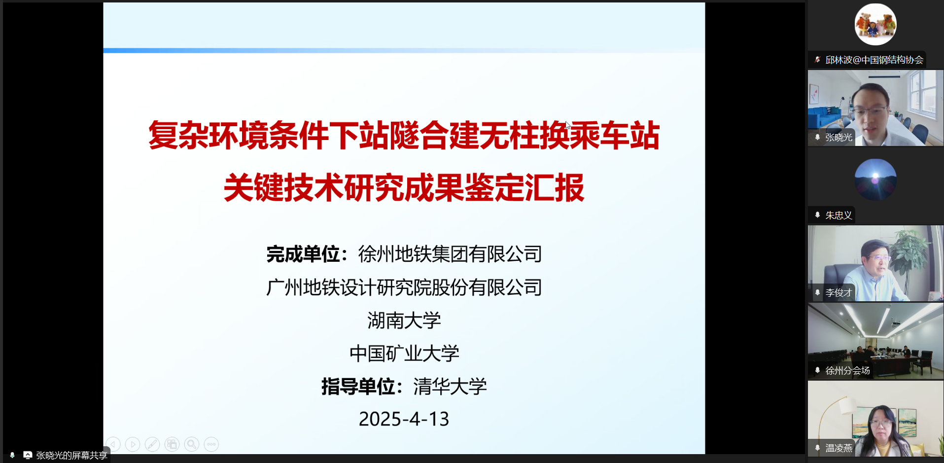 2025年4月13日,中国钢结构协会组织召开“复杂条件下站隧合建无柱换乘车站设计关键技术研究” (子课题:站隧合建无柱换乘车站结构关键技术研究、复杂地质条件下深基坑岩石边坡变形规律及支护控制技术)科技成果评价会。该成果由徐州地铁集团有限公司、广州地铁设计研究股份有限公司、湖南大学、中国矿业大学等单位共同完成。