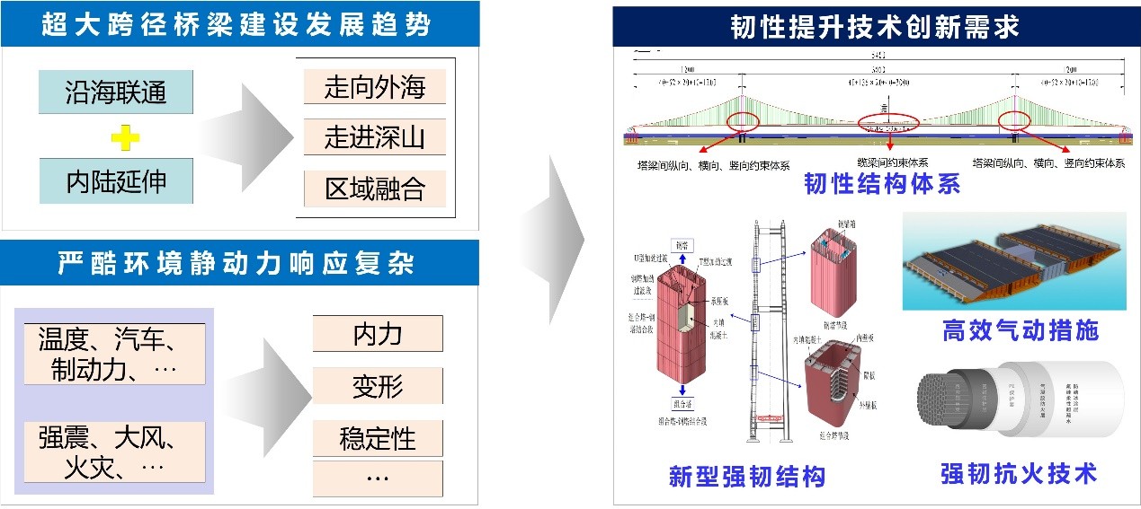 大跨径钢结构缆索承重桥梁在越江跨海、穿越峡谷中得到广泛应用,但在强震、强风、火灾等典型灾害及温度、重载等运营荷载作用下的安全韧性能力亟需提升。本项目积极响应国家重大战略需求,依托国家自然科学基金、国家863计划、国家重点研发计划、交通运输部重大科技专项等科研项目的持续支持,聚焦大跨径钢结构缆索承重桥梁韧性结构体系、新型强韧结构、高效气动措施、缆索耐火技术等关键难题,通过理论分析、数值模拟、模型试验、现场测试、装置研发及工程验证,取得了一系列的创新成果。