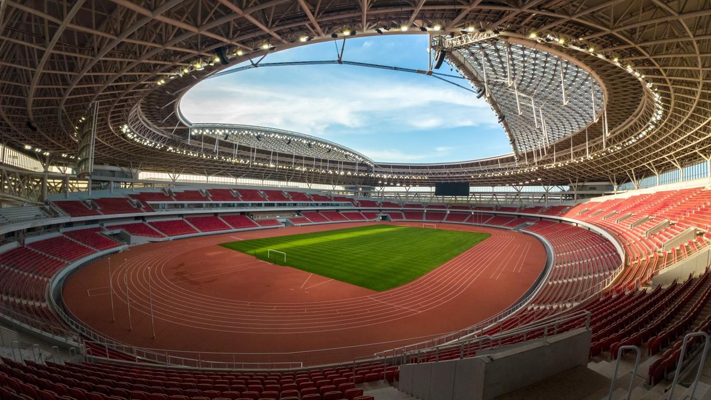 通过设置斜柱框架等,实现无直立柱效果,并兼顾下部结构对屋盖的承接作用;同时南立面采用拱+桁架空间结构体系,安装时拱脚自由变形、待上部结构卸载后锁定,以降低拱脚推力;看台首次大规模应用型钢混凝土组合肋梁看台,看台板重量减少1/3,并通过预埋C型槽的做法大大降低了对原结构的影响。