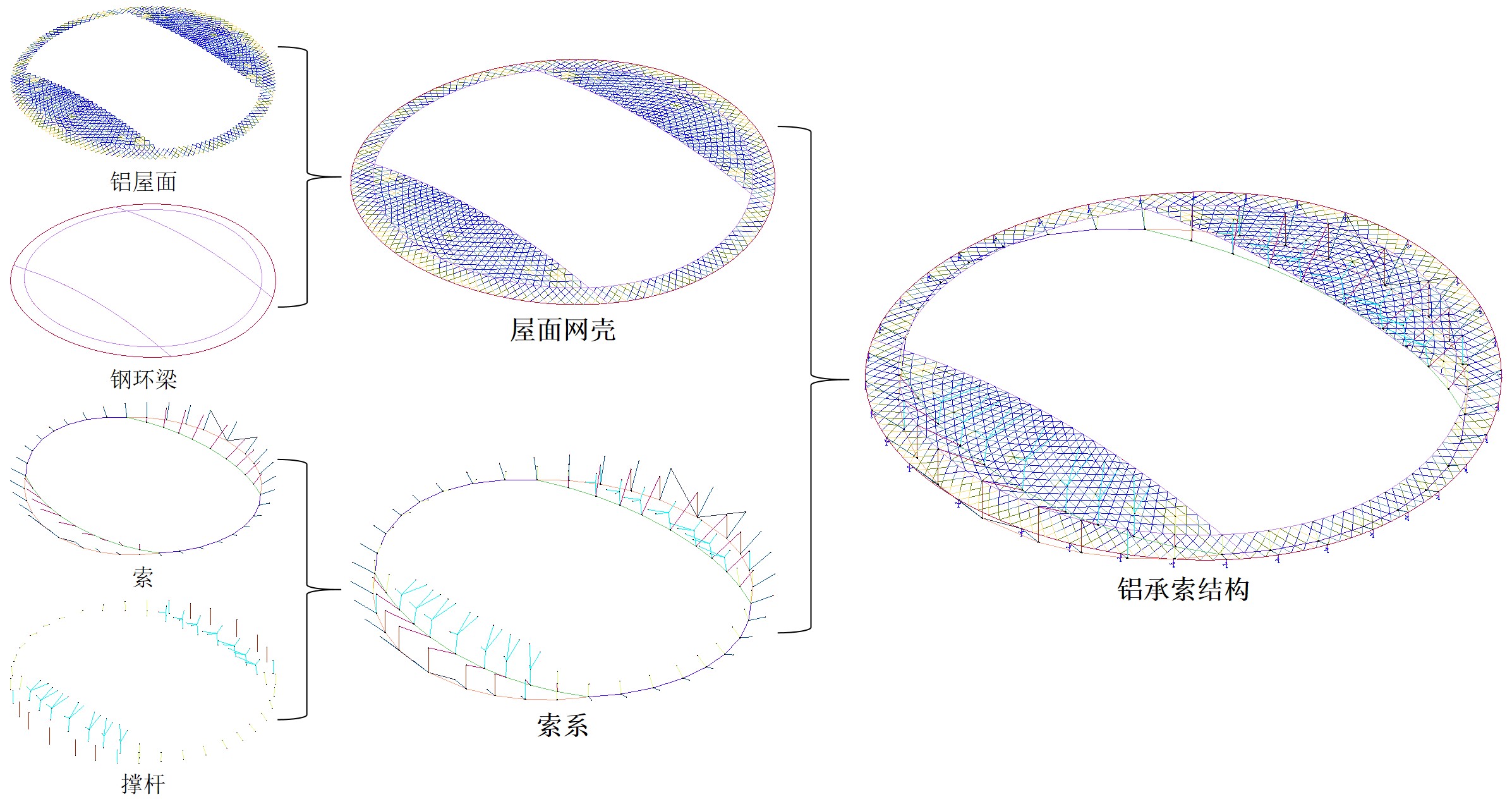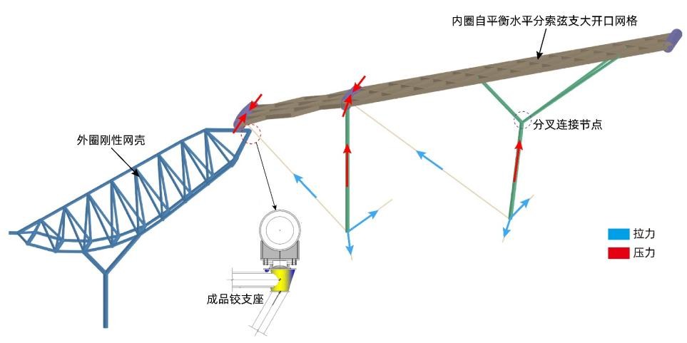 该体系使索力极差由55%降至30%,解决了常规索承结构对不规则建筑平面的适应能力。张拉过程中底部支座水平滑动,以规避内圈结构预应力引起的“内耗”,屋面附加恒载施工完成后安装弹簧和阻尼件,减小后续使用中外围钢结构的水平剪力,同时内圈网壳成为整体结构顶部的“质量阻尼”,有效降低地震作用。