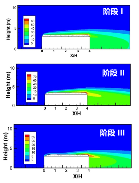 图1 不同阶段屋面周边的雪浓度分布