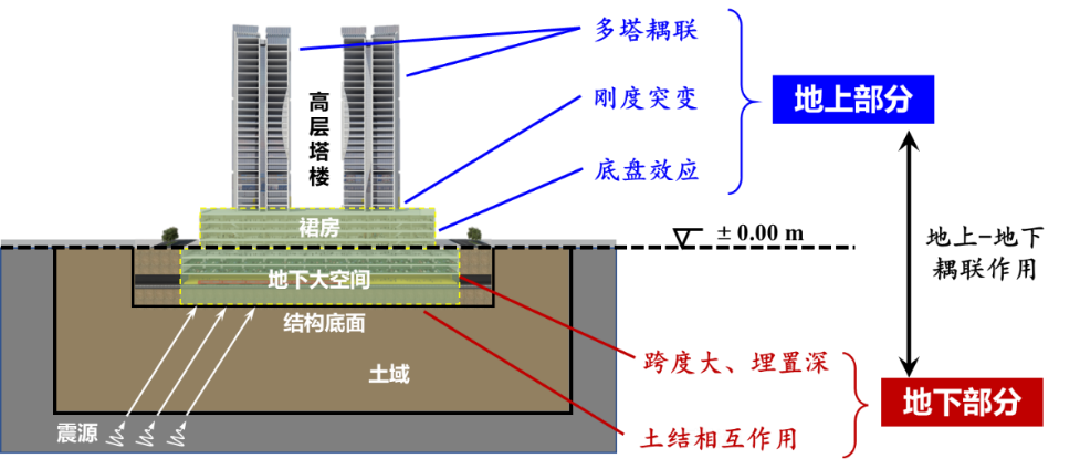 为缓解土地资源约束并提升城市的功能承载能力与效率,集交通、居住、办公、商业、餐饮等多功能于一体的城市综合体大量涌现。城市综合体多采用钢-混凝土混合的结构形式,且以“大底盘裙房-塔楼”形式最为典型,普遍呈现多塔耦联、刚度突变、大底盘效应等复杂特征(图1)。在地震动激励下,城市综合体复杂结构受功能复合性、结构耦合性、刚度突变性及基础非刚性等综合因素影响,其动力响应特性显著区别于普通建筑结构。深入探究此类结构在地震作用下的灾变演化机理与性能提升技术,是我国防灾减灾领域的重大前沿课题。