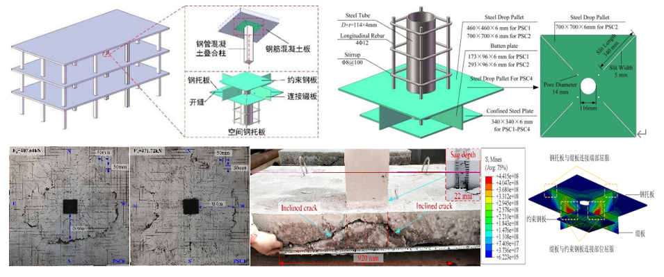 (1)研发了高性能钢-混凝土组合板柱结构,揭示了结构薄弱部位抗连续倒塌破坏机理,探明了影响倒塌性能的关键设计参数,建立了精细化数值模型,阐明了钢托板、混凝土强度等参数对抗倒塌性能的影响规律,解决了兼顾提高冲切性能和延性的技术难题。