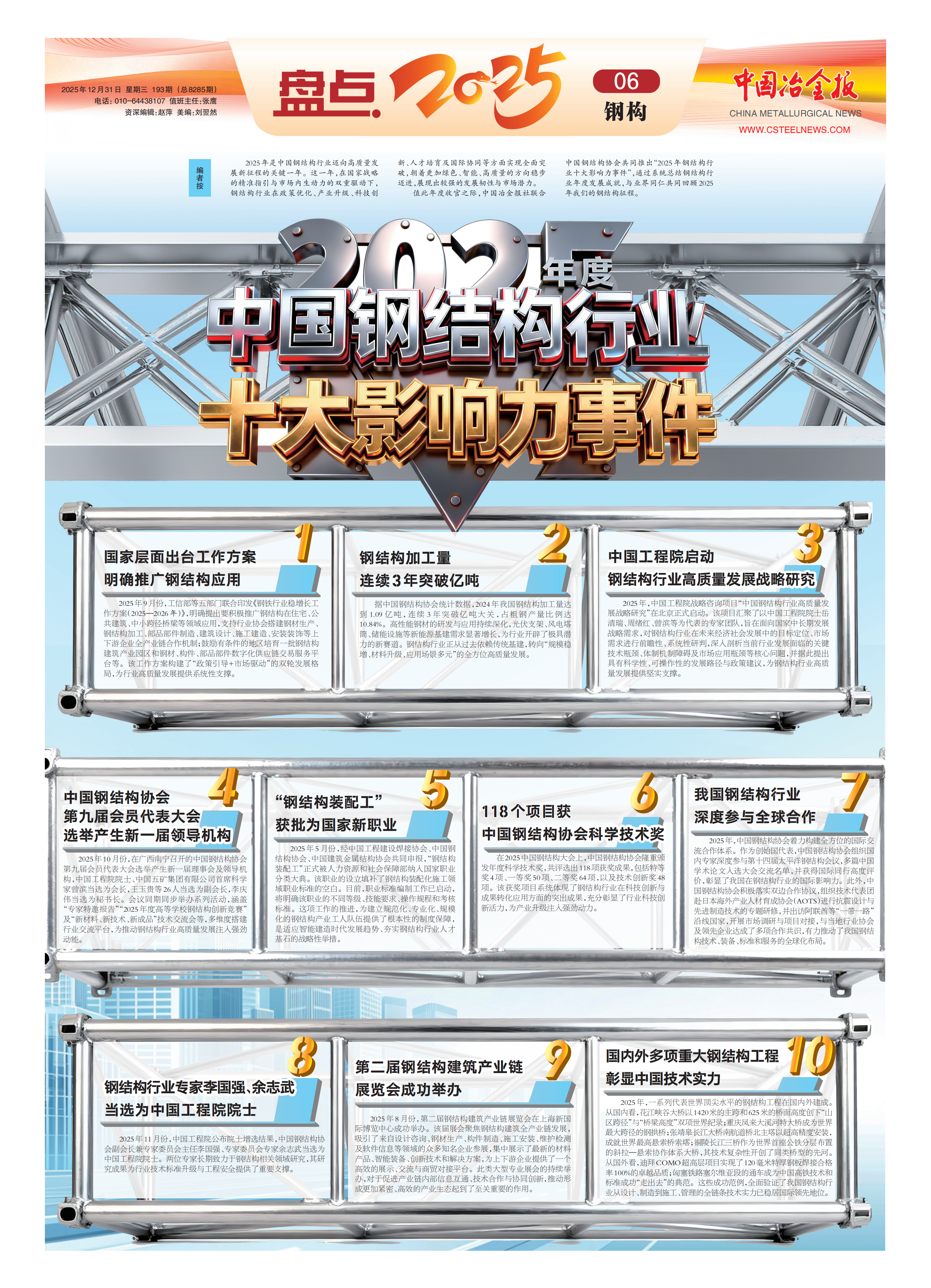 2025年,是我国钢结构行业迈向高质量发展新征程的关键一年。在国家战略的精准指引与市场内生动力的双重驱动下,行业在政策布局、产业规模、科技创新、国际协同等各方面均取得了较大进展,展现出较强的发展韧性与市场潜力。为系统总结钢结构行业年度成就,特此梳理并呈现十大行业事件。
