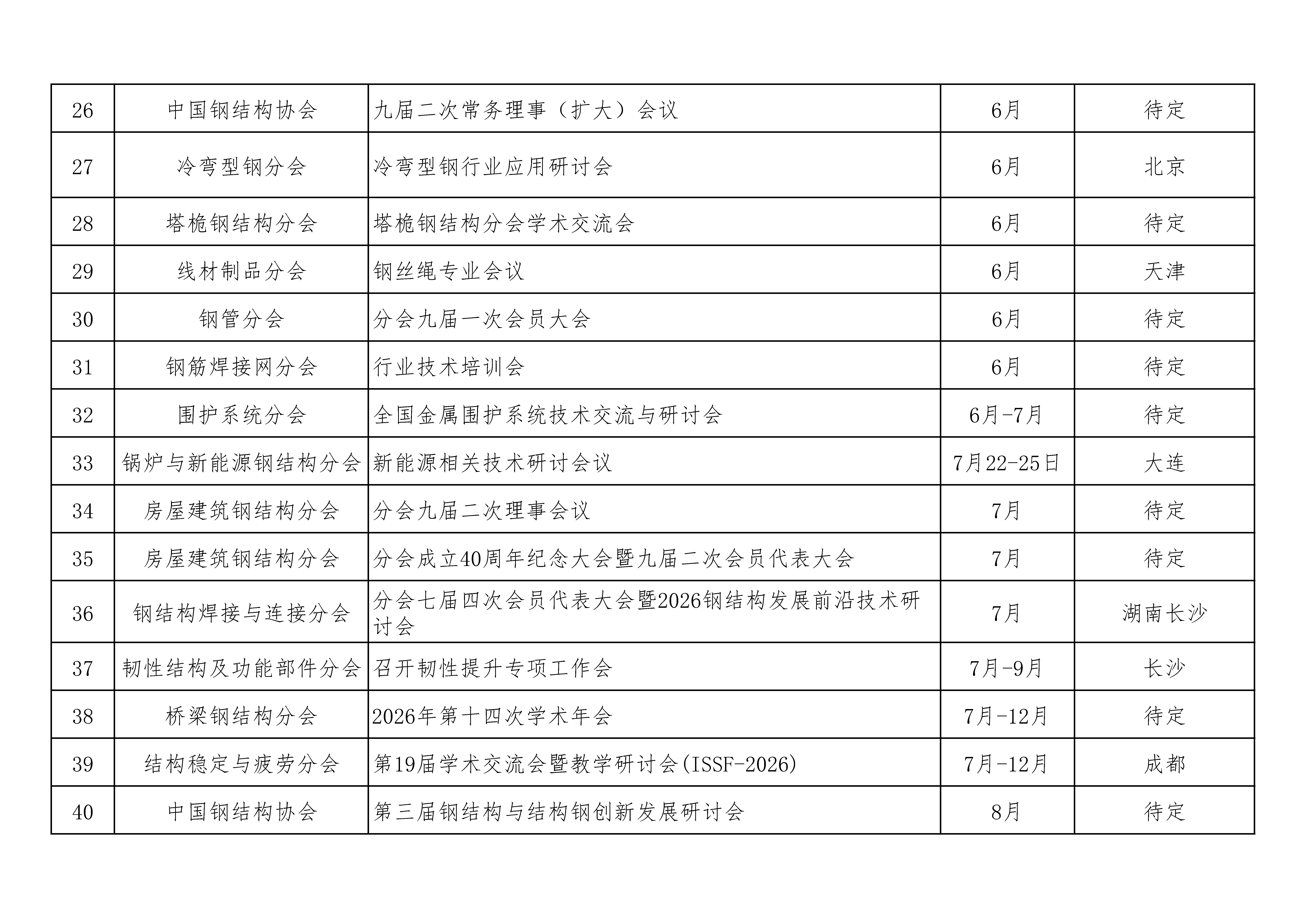 中国钢结构协会2026年度主要活动一览表