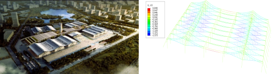 弥勒圣坛龙华法堂建筑南北方向长度183m,东西方向长度120m,建筑面积21600m2,为典型的大跨网壳结构。采用本项目大跨网格结构抗火设计方法后,该工程项目可以不涂覆钢结构防火涂料,节约较大的工程投资,产生了较大的经济、社会和环境效益。