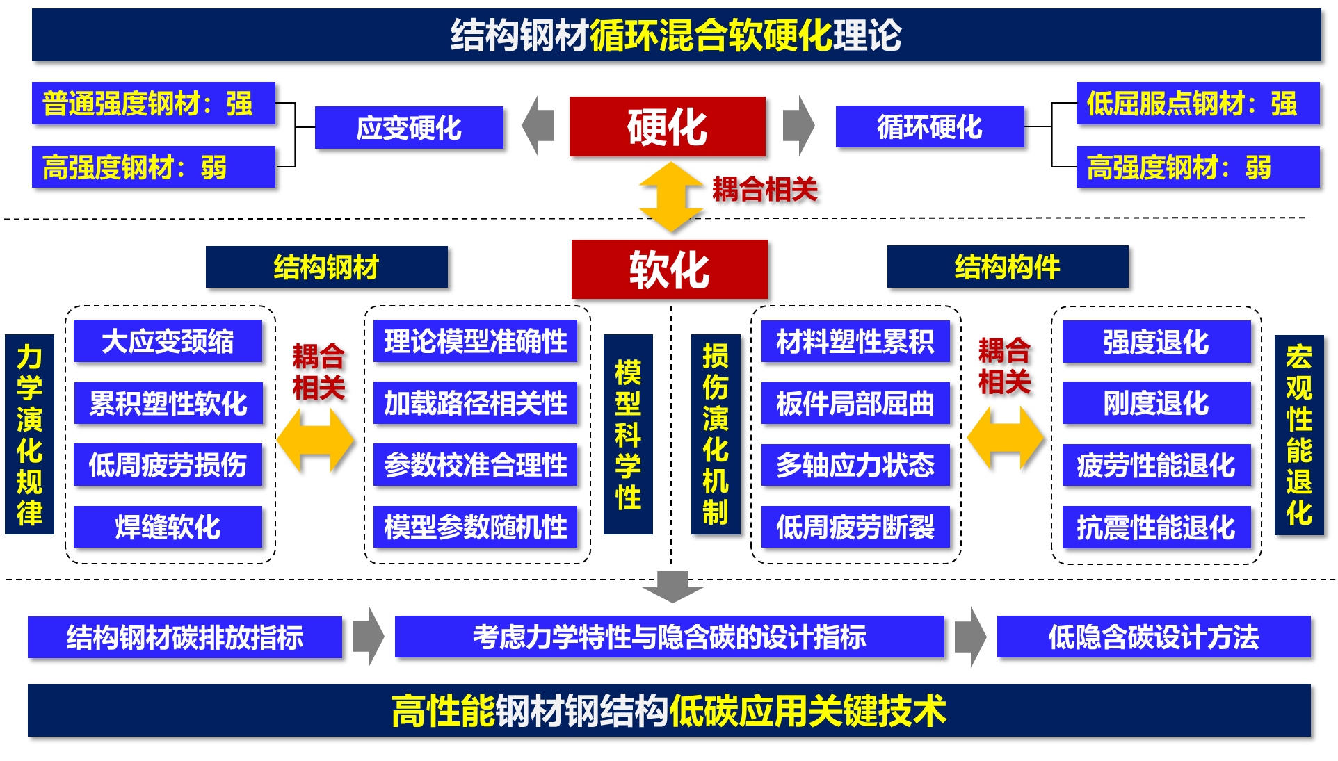 我国建筑与建筑业建造全过程碳排放占全国碳排放比重接近50%,其中建材生产运输占比超25%,建筑用钢铁材料碳排放占建材生产运输比例近52%,建筑钢结构的低碳化发展是实现我国“双碳”目标的关键任务。另一方面,新型服役环境和社会发展需求对钢结构提出了更高的性能要求,推动高性能钢材大规模工程应用是实现建筑钢结构“节能降碳”和“性能提升”的关键路径。然而,高性能钢材钢结构的力学行为与传统钢结构存在差异,其承载性能及抗震性能的准确分析,需要更高精度的材料本构模型和结构分析模型。另外,实现高性能钢结构的低碳发展需要兼具低碳效益的设计指标体系和理论方法。因此,本项目聚焦于结构钢材及构件复杂力学行为分析的基础理论,以及高性能钢材低碳工程应用的关键技术,通过物理建模、试验验证、数值模拟和工程应用,形成了一系列创新成果。