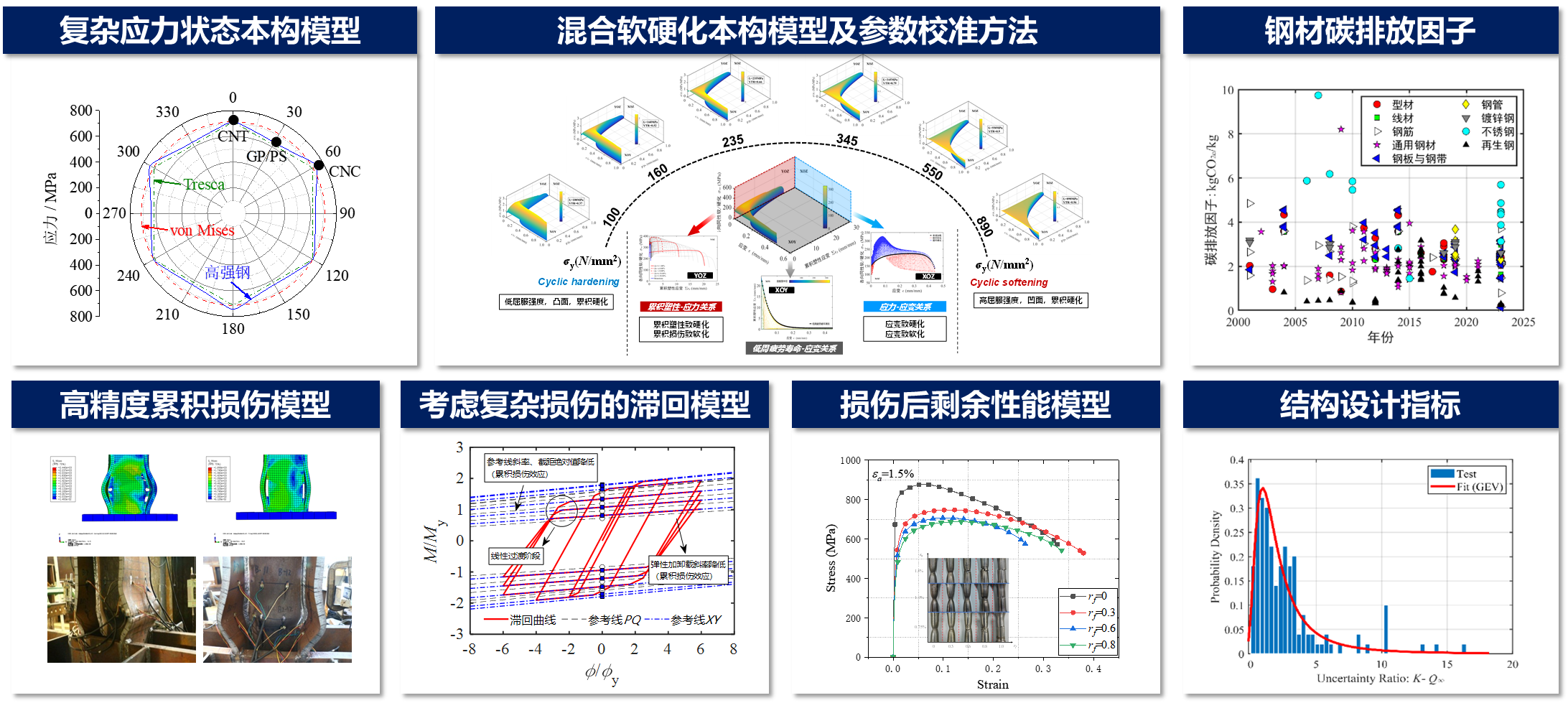 【材料性能模型】建立了结构钢材循环混合软硬化本构模型、高强度钢材三维屈服准则和滞回本构模型,提出了循环本构模型参数标准化校准方法,提升了对高性能钢材复杂力学行为的模拟精度。