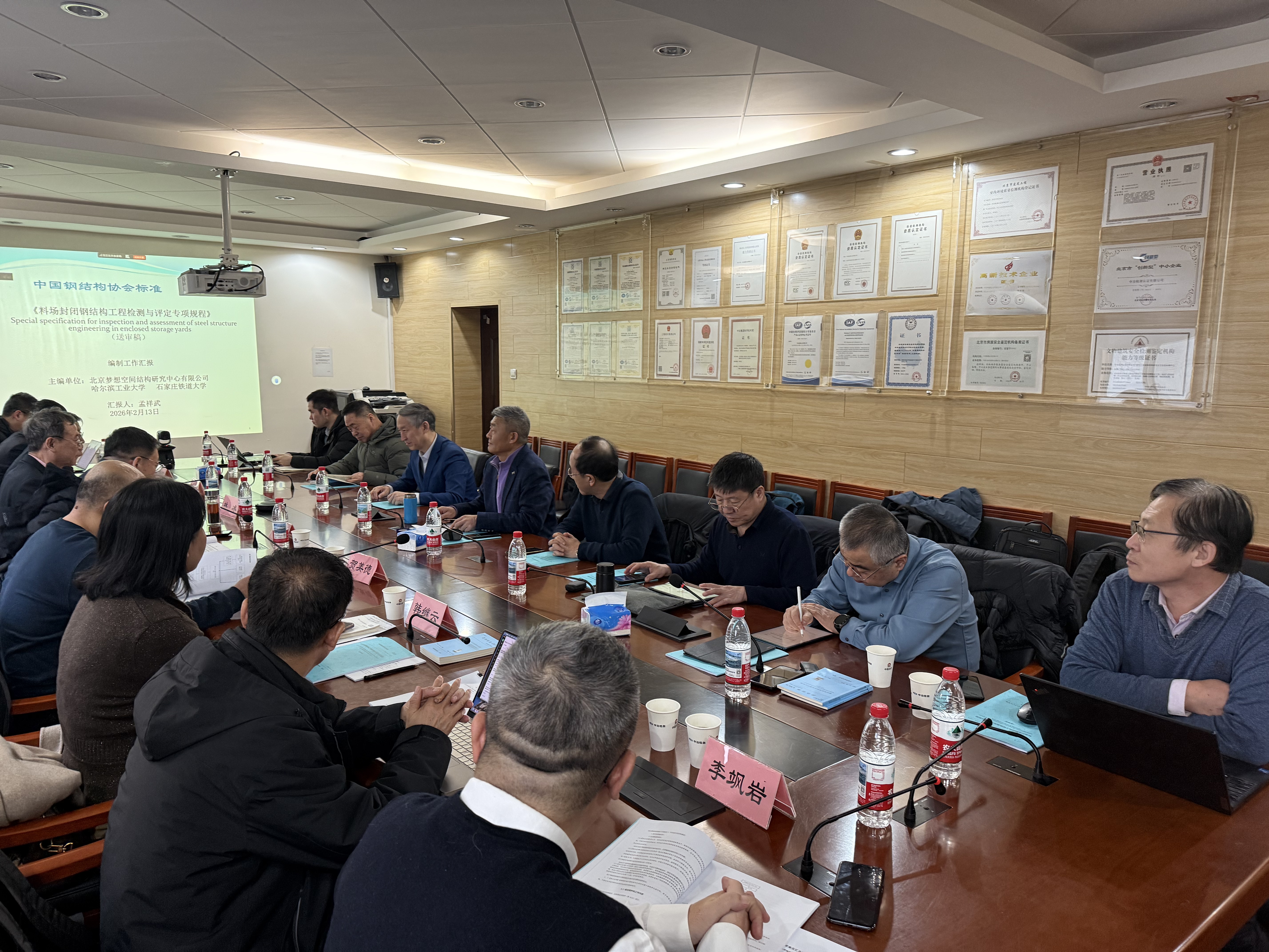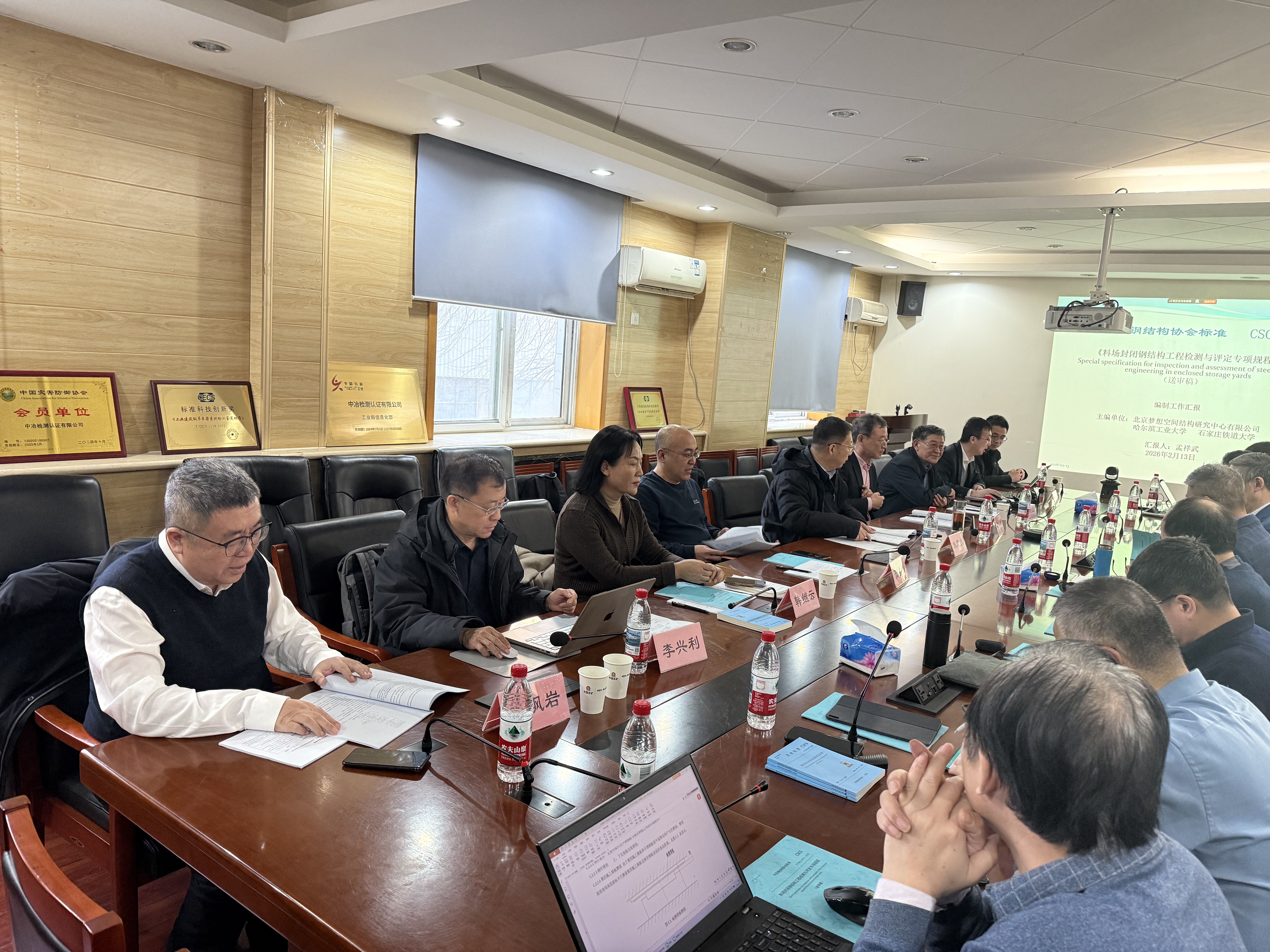 审查会上,北京梦想空间结构研究中心有限公司总工程师孟祥武汇报了标准编制背景、技术内容和征求意见情况。审查专家组逐章逐条对《料场封闭钢结构工程检测与评定专项规程》进行了认真细致的审查,提出了修改意见和建议。标准编制组成员对专家组提出的问题进行了答复。