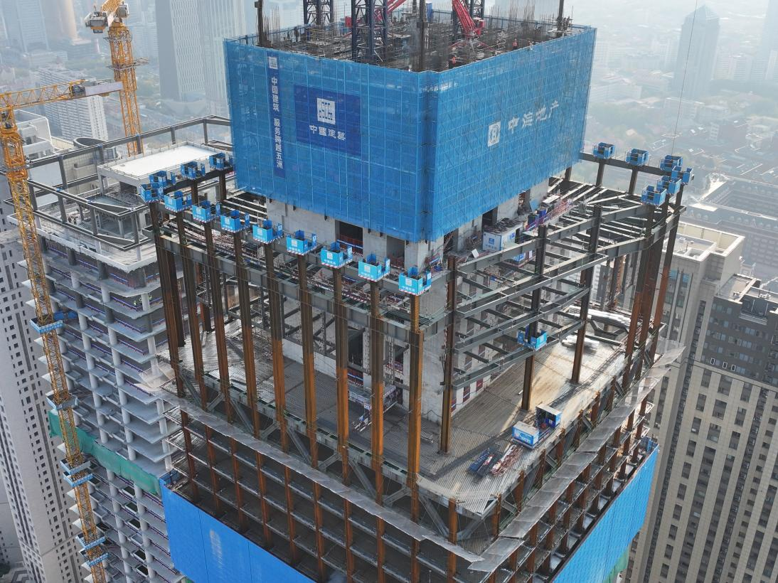 该成果依托天津中海城市广场项目3号楼完成。工程建筑高度为339.9米,其主体采用“SRC斜向密柱外框架+钢筋混凝土核心筒+空间环带桁架”混合结构体系。外框架柱以“1.75度-1.84度倾角”螺旋上升,引发出了三大技术难题:一是斜向密柱体系的焊接约束应力和焊接残余变形控制相比传统结构面临全新挑战;二是外框架空间位形控制要求严苛,需解决倾斜构件三维定位测量、逐层空间坐标传递、施工累积误差控制等技术障碍;三是结构体系形成过程中存在时变力学特性,需攻克斜柱与核心筒差异变形协调、环带桁架预调值设定等难题。
