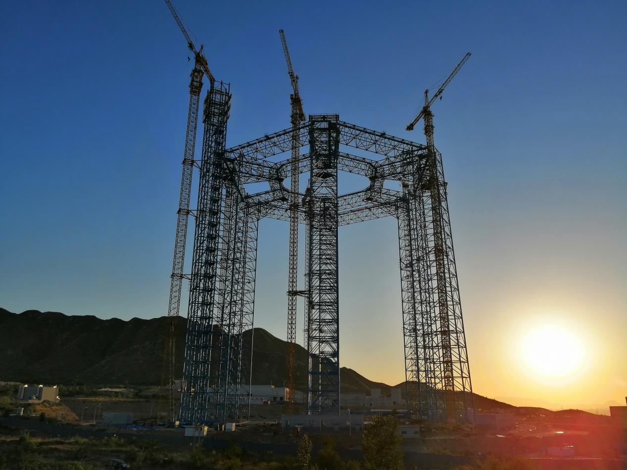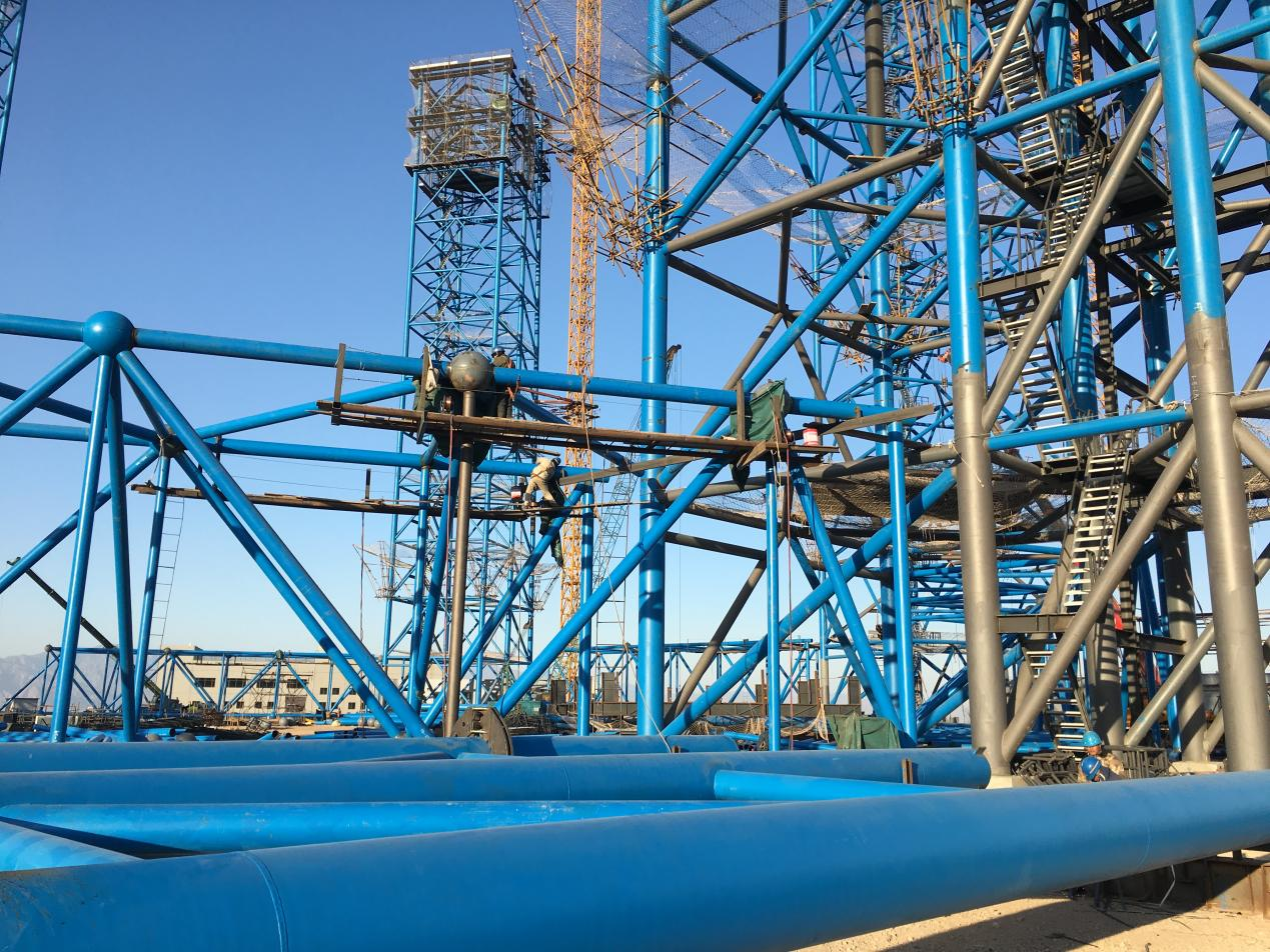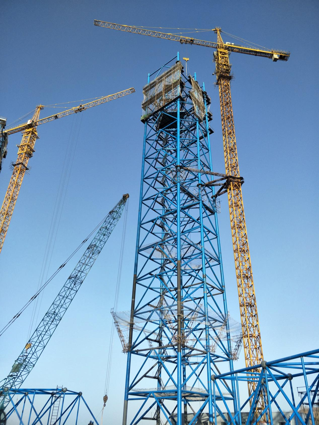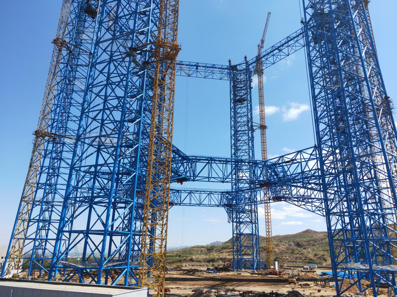 1)施工技术方面,研发出钢桁架分片自翻转累积提升、超高塔架多操作面组合施工平台等技术。