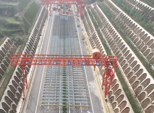 跨越深沟 V 型峡谷,采用新型大桥组合杆件,主体墩身形成40 m大跨度组合支架体系,在既有高速路基上,设置一种用于钢箱梁拼装运输一体式长线胎架,在路基中央分隔带两侧使用双车抬运钢箱梁,解决了受限空间范围内大型吊装、运输设备无法使用及跨越深谷、曲线运梁的难题。
