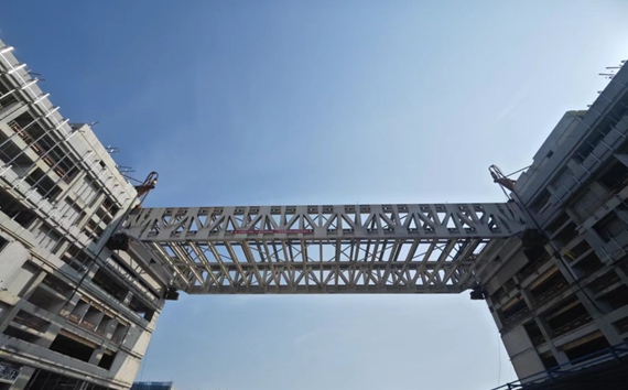 本项目背景工程为“安徽大学江淮学院新校区项目-2标段”,钢连廊跨度大(最大跨度64.8m)、重量大(最大重量980t)。本项目连廊整体提升架安装保安全、整体提升保同步(四个吊点)、牛腿安装保安全、高空作业防高坠是本项目需关注的重点难点。为解决上述关键技术问题,优化大覆盖面积、超重桁架地面拼装胎架设计方法,建立大跨度钢桁架预起拱优化方法,研发工地环境下高强钢厚板焊接质量控制方法,设计大跨度、超重空间钢桁架液压整体提升精度控制优化技术,优化提升架、上下吊点设计方法。