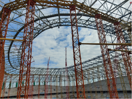 重庆龙兴足球场是重庆市打造的首座大型专业足球场,建成后将承办2023年亚洲杯足球赛事,预计2022年10月完工试运行。西南分公司自承接项目以来,仅仅13个月20天,顺利完成钢结构封顶,比原计划提前12天完成节点目标,标志着足球场结构部分全部完成,即将全面进入金属屋面及幕墙装饰装修施工阶段,创2023年亚洲杯新建场馆建设速度第一。目前,球场外形已经完全显现。