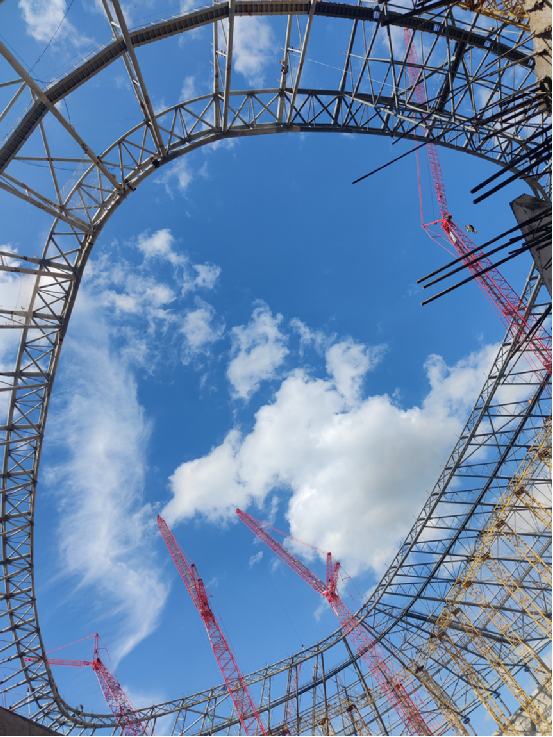 随着全部钢结构支撑架拆除,重庆龙兴足球场重达14000吨的罩棚钢结构顺利封顶,球场罩棚钢结构已经完全合拢,从看台仰视球场,格外震撼。现场一片忙碌,机械、工人正有序施工,进行护栏吊装、人行通道施工等。