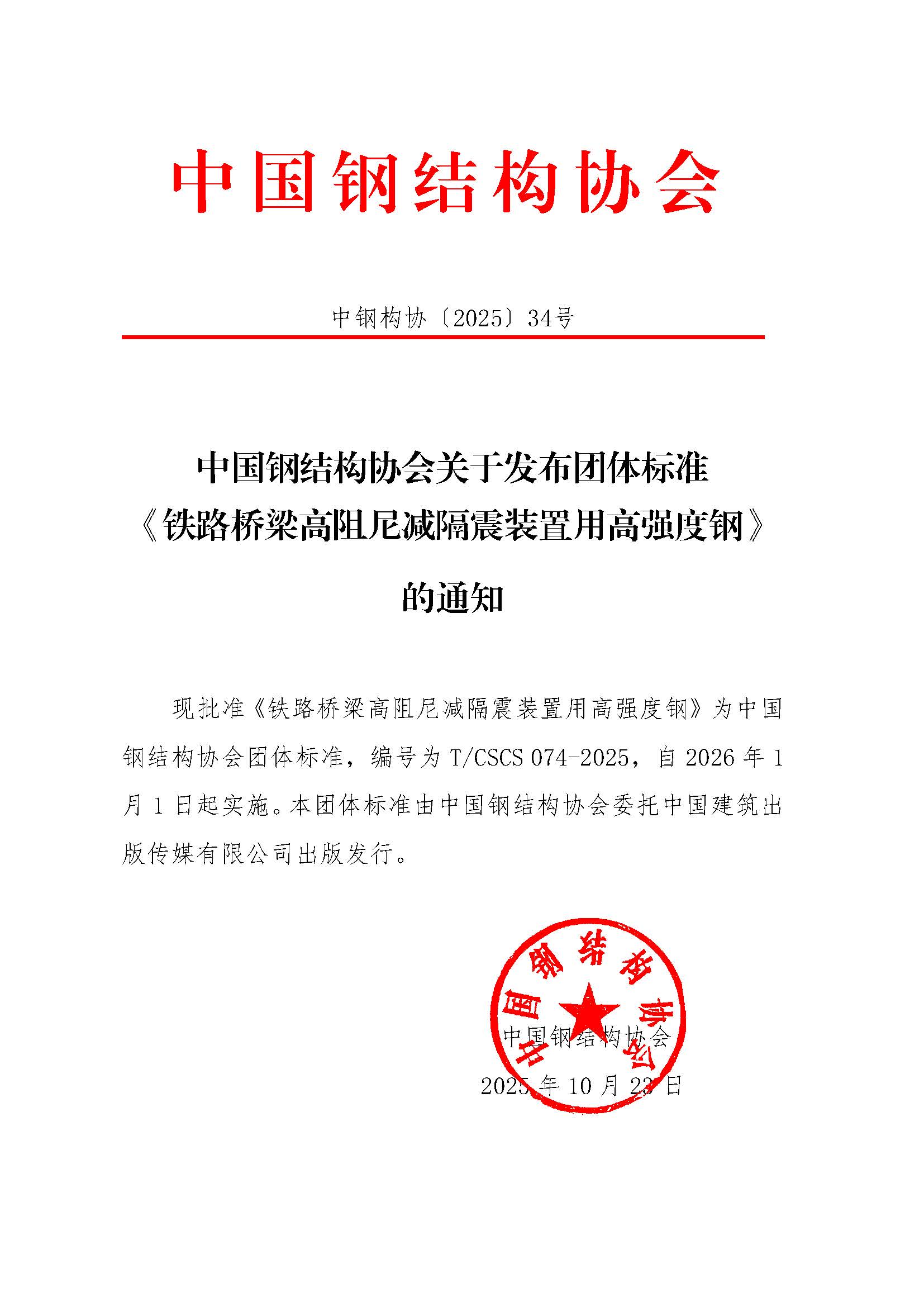 中国钢结构协会关于发布团体标准《铁路桥梁高阻尼减隔震装置用高强度钢》的通知