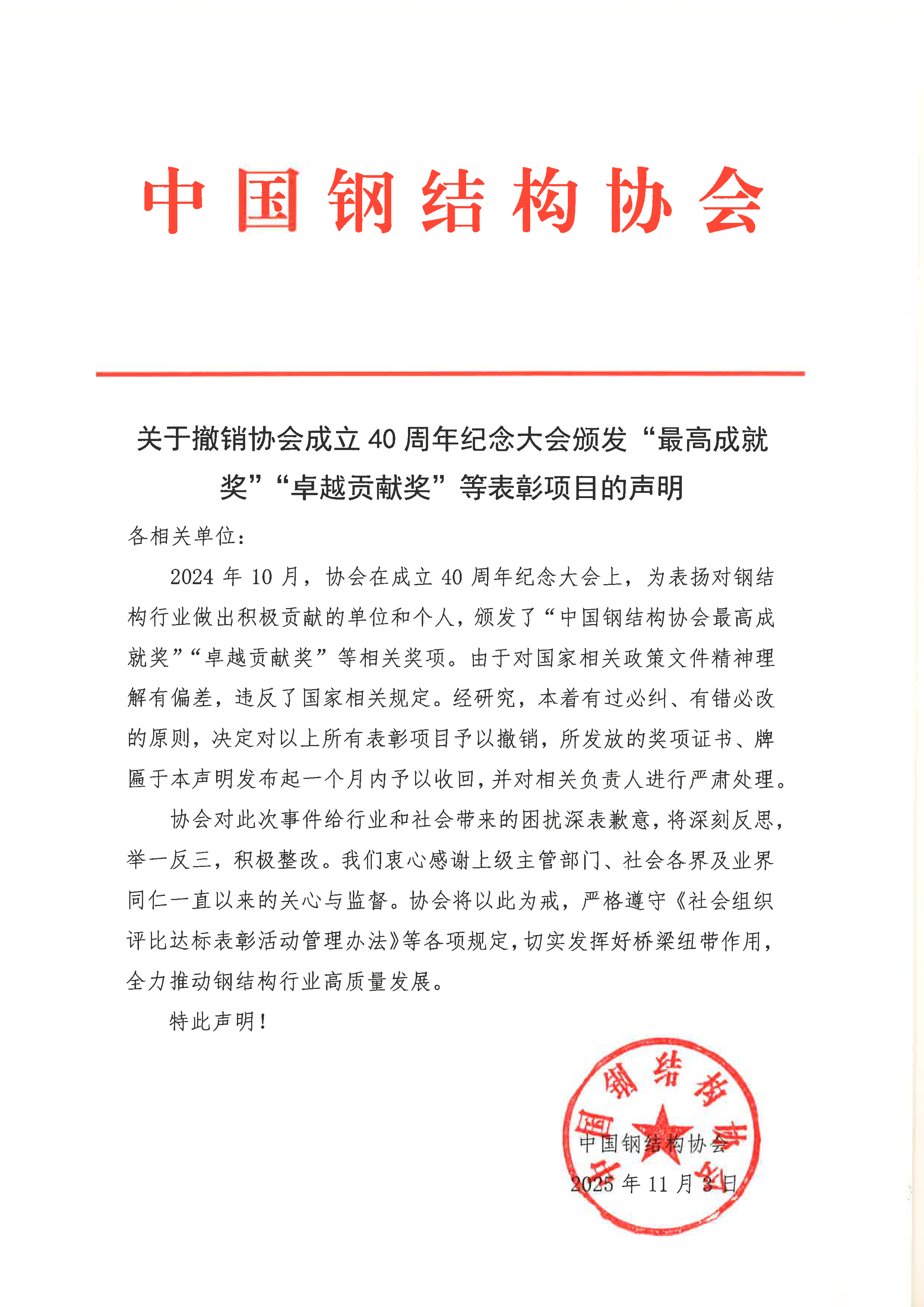 关于撤销协会成立40周年纪念大会颁发“最高成就奖”“卓越贡献奖”等表彰项目的声明