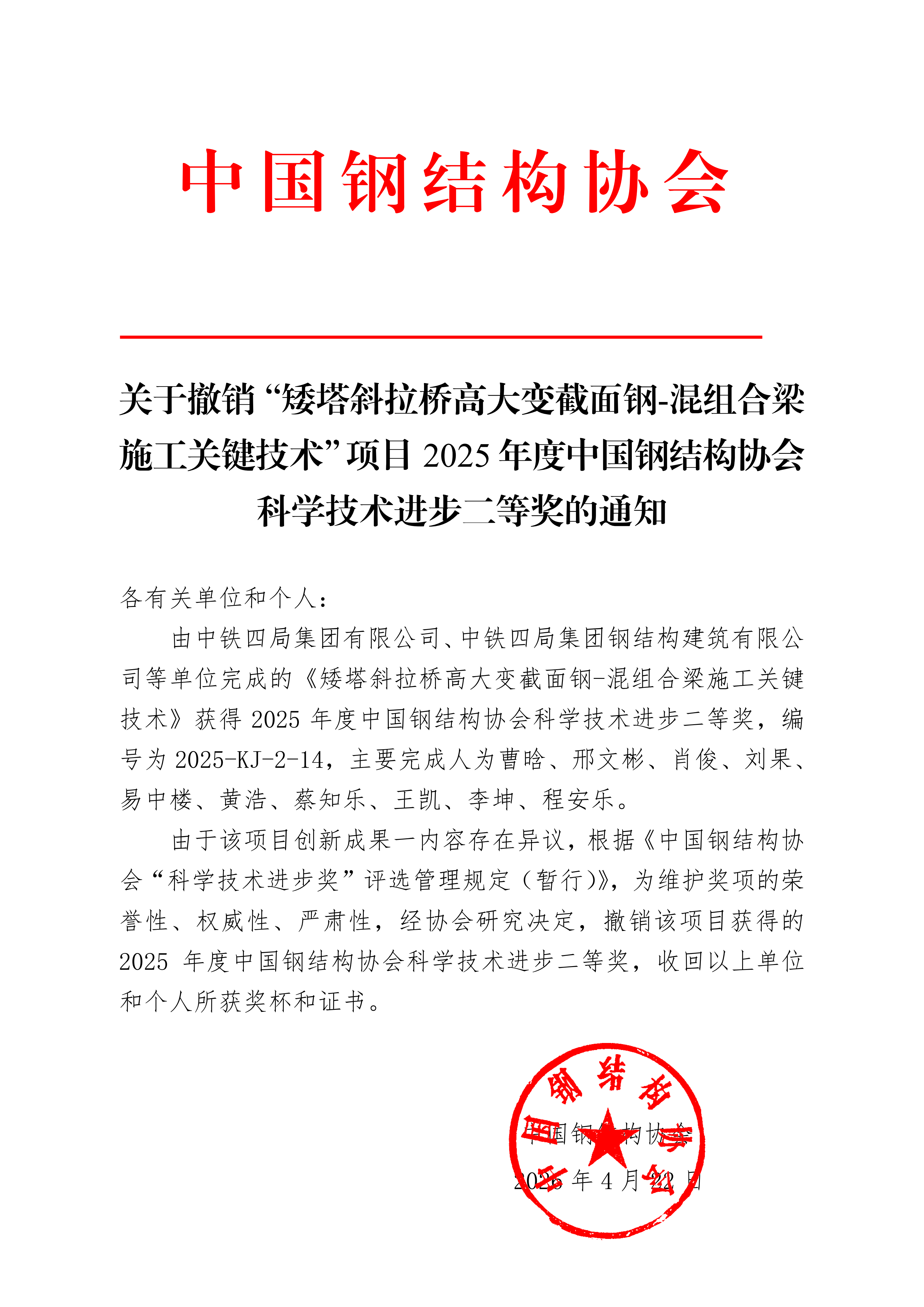 关于撤销“矮塔斜拉桥高大变截面钢-混组合梁施工关键技术”项目 2025 年度中国钢结构协会科学技术进步二等奖的通知